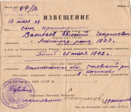 Eё сын, Васильев Евгений Георгиевич (1923-1942), после окончания летного училища был отправлен на фронт и погиб в первом же воздушном бою. Ему было всего 19 лет.