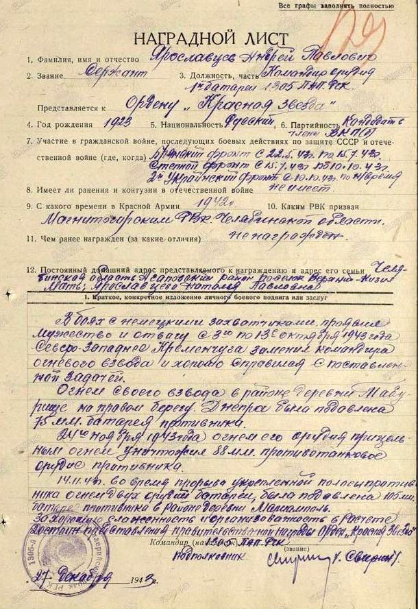 Ярославцев Андрей Павлович 23 г.р., родной брат нашей прабабушки. На момент начала войны ему исполнилось 18 лет. Сначала он прошел подготовку для отправки на фронт, а в 1942 поступил на службу в Красную Армию. Их с бабушкой отца в 1936 г. забрали по линии НКВД, и больше семья его не видела, а мать умерла в начале войны. Нашу прабабушку Зою (8 лет) с сестрой Валей (3 года) отдали в детский дом, где их в дальнейшем нашли родственники. Однако к тому времени прабабушкину сестру забрали в другую семью. Окончание войны застало прадеда в Австрии, а когда он вернулся домой, то сразу начал искать сестер. Прабабушку Зою он сразу нашел у родственников, а прабабушку Валю только спустя 42 года. Из документов, найденных в архиве семьи, мы узнали, что Андрей Павлович был мужественным человеком, отважным воином, который в трудную минуту мог организовать своих сослуживцев и успешно завершить поставленные задачи, за что и был награжден орденом «Красная Звезда».  |