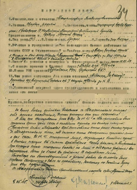 Из наградного листа: «…За время боевых действий дивизии товарищ Мамрикишвили показал себя смелым, находчивым, хорошо знающим своё дело связиста. Благодаря его самоотверженной умелой работе все команды были переданы своевременно и залп по противнику, засевшему на западном берегу реки Одер прошел успешно. Всего за 5 часов он устранил 12 повреждений линий. Под сильным огнем своевременно выходил на связь….».