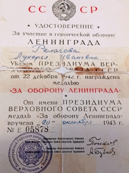 В 13 лет бабушка вместе с сестрой Валентиной попали в детский дом. От туда после окончания войны их забрала тетушка Рехачева Лукерья Ивановна, которая всю блокаду проработала в трамвайном парке и смогла выжить в эти страшные Блокадные годы. Лукерья Ивановна награждена медалью «За оборону Ленинграда».