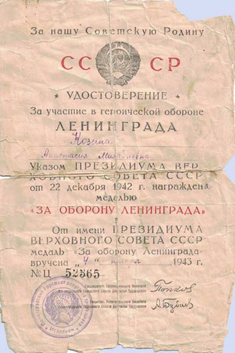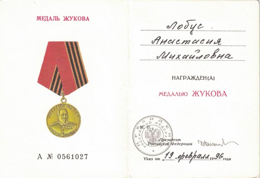 Вместе с мужем Лобусом Дмитрием Прохоровичем (прадедушка Насти) всю блокаду оставались в Ленинграде. Они работали на барже, на которой перевозили оружие в Ораниенбаум и Кронштадт. Баржа ходила от набережной Макарова. Ходили под бомбежкой. У дедушки было много ранений. Дедушка умер от ран 28 июля 1968 года. И бабушка, и дедушка имеют награды.