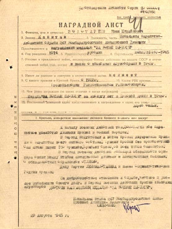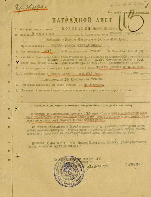 обеспечил переправу всей дивизии. В этом бою был ранен. Был удостоен Правительственной наградой – ордена «Красная звезда».